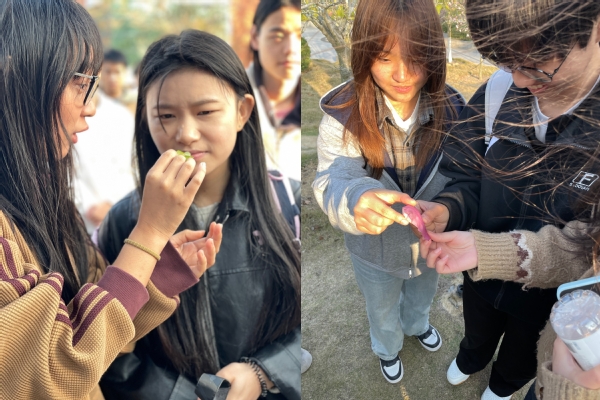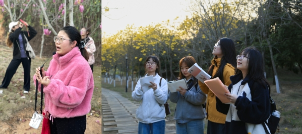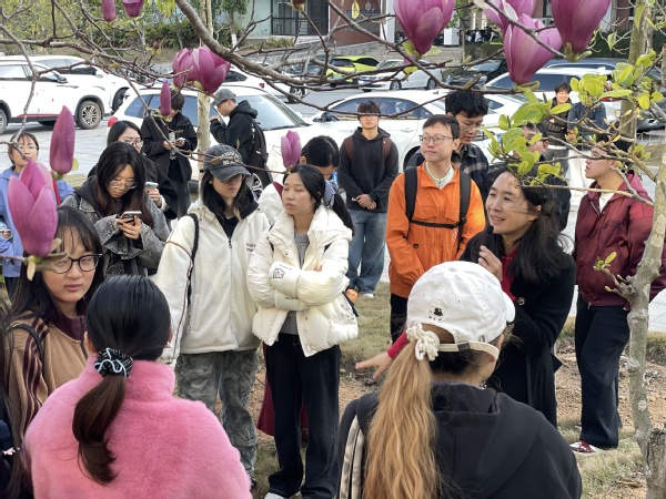 下午16:30,师生们在经管楼与理工楼间的玉兰广场集合,带着放大镜、便携显微镜、望远镜、记录本等观察工具,沿着预设路线漫步校园。活动以寻春迹实践探索为核心,引导学生们启动视觉、嗅觉、触觉等多重感官,全方位感知春天的生命律动。