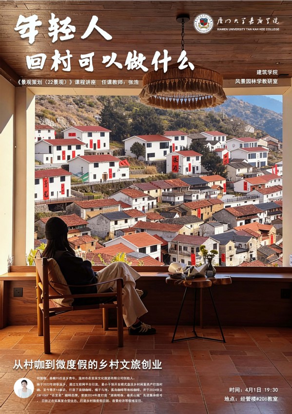 4月1日,受风景园林学教研室邀请,温州市在发呆文化旅游有限公司创始人何微微再度走进《景观策划》课堂,分享如何通过“最小干预”盘活乡村闲置资产,打造文旅地标品牌。在讲座开始前,何微微与风景园林学教研室主任庄晓敏副教授、秦艽老师、魏翔燕老师、任课教师张浩老师进行了座谈。