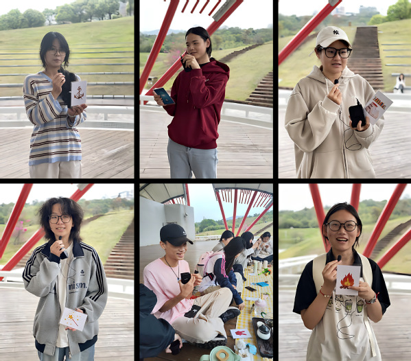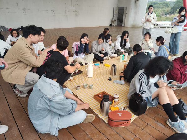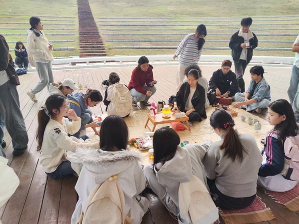 活动现场茶香氤氲,课程教师精心准备了花茶、果茶、绿茶等多款茶饮,同学们也自发携带个人茶具与珍藏茶叶到场,围坐共沏香茗。春雨淅沥洒落,校园美景尽收眼底,师生围坐其间赏景听雨,在自然声响与清雅茶香的交融中放松身心,唤醒五感觉知,真切感受自然赋予的平静与治愈力量。